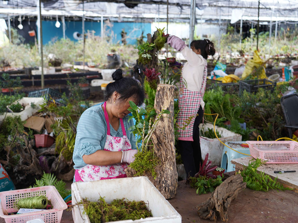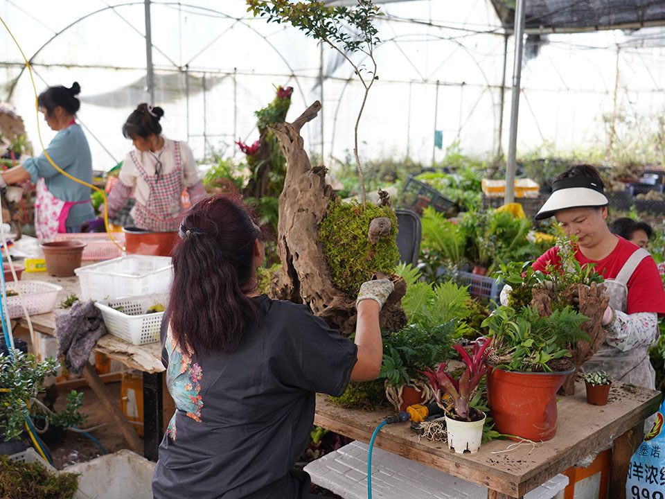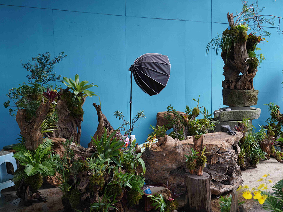 “我们发现,现在的人买绿植不只是‘绿化’,更追求‘治愈感’。”基地负责人栾总介绍,团队梳理出20余种适合直播的“网红款”——比如一些创意花卉,以石斛、兰花等寄生类植物设计组合的创意产品。筛选出石斛、树萝卜、小叶赤楠等23个耐运输品种,通过“直播讲解+养护教程”的沉浸式营销,使绿植溢价超10倍。其中一款“石斛兰创意盆景”单品销量达2.1万盆,复购率42%。目前基地日均直播2场,单场最高观看量超10万人次,月销售额突破50万元,绿植单价从传统批发价的10—80元提升至100—1000元,溢价超10倍。