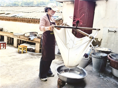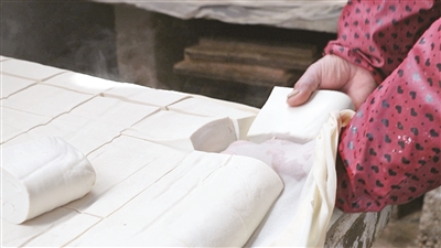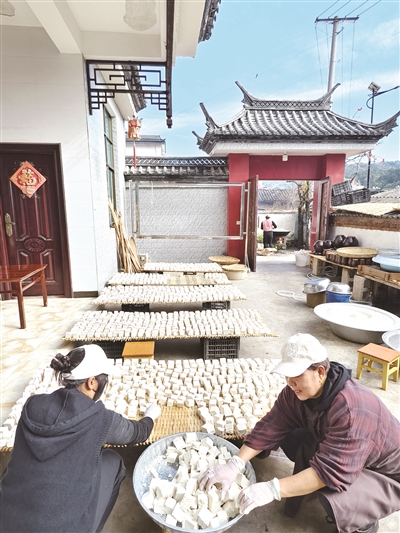 清晨,天还未亮,大庄村杨汝平家的豆腐作坊里已是一片忙碌。杨汝平与3名女工正有条不紊地加工着今日客户订购的白豆腐和毛豆腐,开启了一天的劳作。