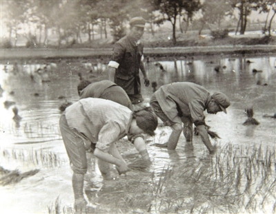 杨善洲(右一)在田里插秧。