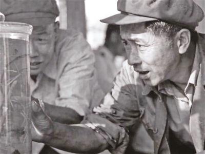 杨善洲观察水稻实验苗。