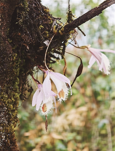 近日,龙陵小黑山省级自然保护区工作人员开展野生植物监测时,发现几株白花独蒜兰悄然绽放在树干之上,素净花朵点缀幽谷,成为山间生态画卷中一抹亮色。