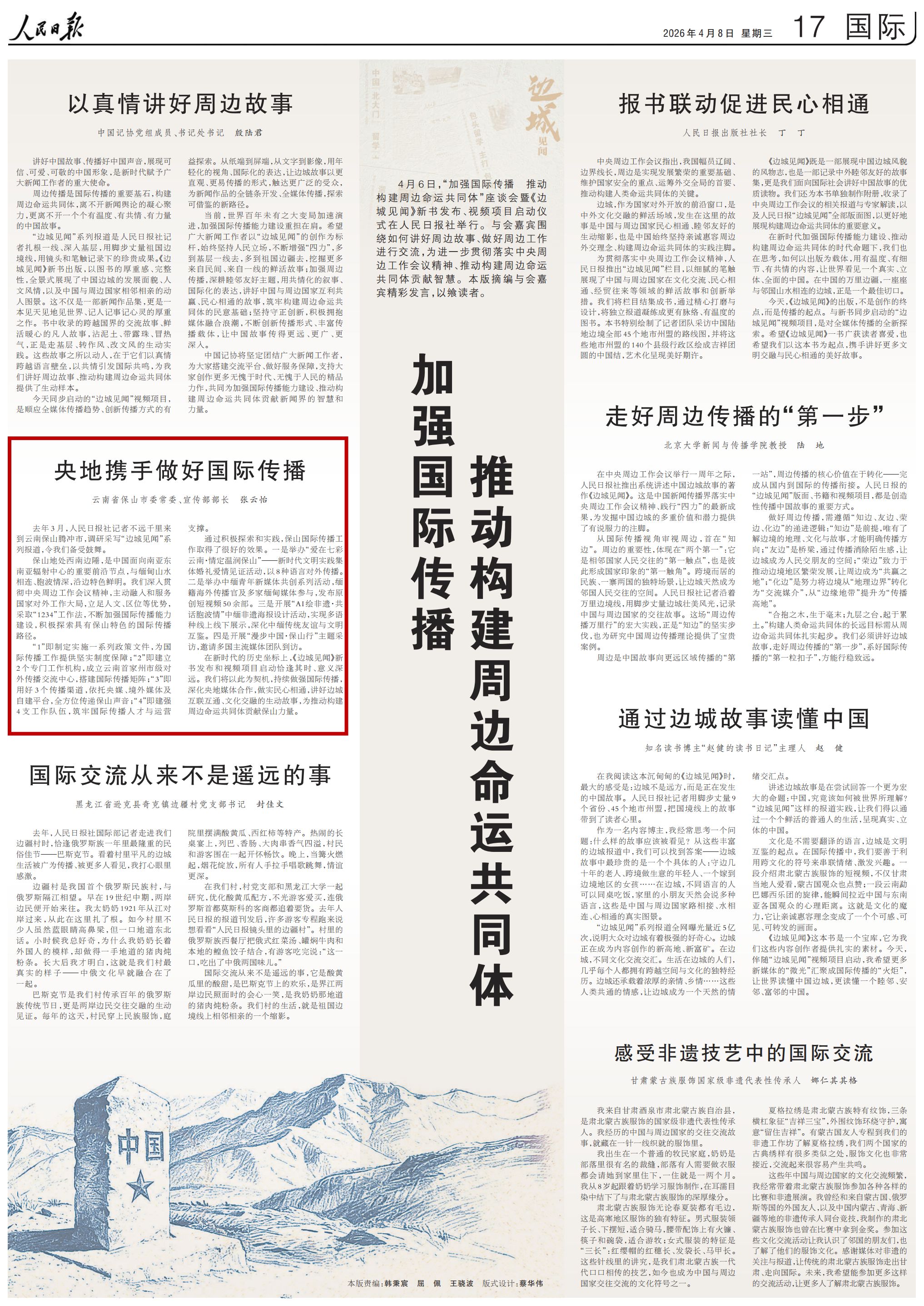 在新时代的历史坐标上,《边城见闻》新书发布和视频项目启动恰逢其时、意义深远。我们将以此为契机,持续做强国际传播,深化央地媒体合作,做实民心相通,讲好边城互联互通、文化交融的生动故事,为推动构建周边命运共同体贡献保山力量。