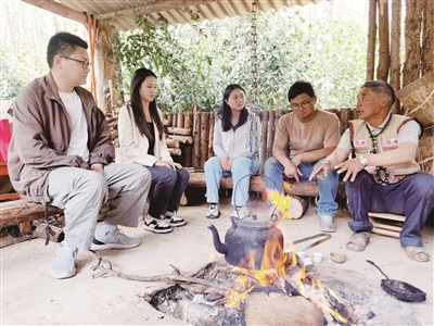 游客李春玲和小伙伴在山间的“烤茶室”里,围着火塘一边听当地有名的“三蹿茶”故事,一边尽情品尝今年的新茶。她说:“‘三蹿茶’和平常喝的茶不一样,闻起来很香,因为它是烤过的茶。第一口喝上去有点苦,喝第二口回甜味就慢慢上升了,喝着挺舒服的。”