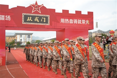 近日,我市各地同步举行2026年上半年新兵欢送仪式。新兵们身着戎装、胸佩红花,高唱强军战歌走过“从戎门”,奔赴军营献身国防,家乡人民以热烈掌声为其壮行。图为昌宁县籍新兵集结场景。
